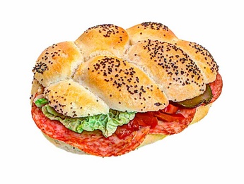 Bageta plněná pikantním salátem Loupežník, zdobená šunkou